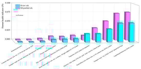 Comparison of the environmental impacts in the SI-raw-oils and SII-purified-oils scenarios for the verbenone process production by process contribution on the human health damage category. Assessment method: ReCiPe 2016 Endpoint (H) V1.04/World (2010) H/A.
