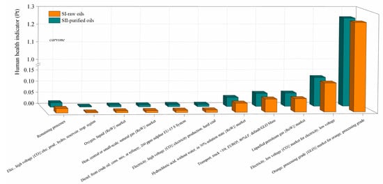 Comparison of the environmental impacts in the SI-raw-oils and SII-purified oils scenarios for the carvone process production by process contribution on the human health damage category. Assessment method: ReCiPe 2016 Endpoint (H) V1.04/World (2010) H/A.