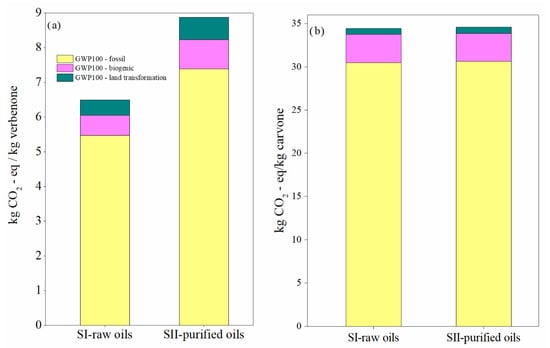 Global warming potential in the SI-raw-oils and SII-purified-oils scenarios for the (a) verbenone and (b) the carvone process production. Assessment method: IPCC 2021 GWP100 v1.0.