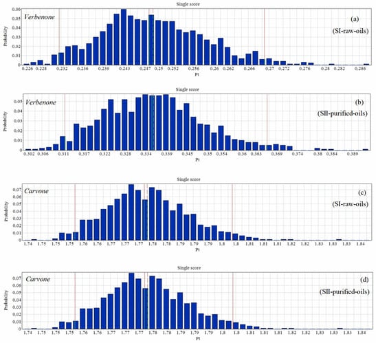 An uncertainty analysis of the environmental impacts of the different scenarios of the process is shown in Figure 13. The single score probability results of the environmental impacts to produce 1 kg/batch of carvone were higher than the probabilities in the production of verbenone. However, the differences between the statistical parameters reported in Table 3 were very similar for the production of carvone since the orange essential oil has high levels of d-limonene concentration and the results do not affect both scenarios evaluated, as presented in Figure 9b and Figure 12b.