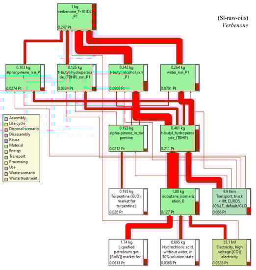 Network diagram by single score of the process for verbenone production in the SI-raw-oils scenario. Assessment method: ReCiPe 2016 Endpoint (H) V1.06/World (2010) H/A. Functional unit: 1 kg of verbenone/batch, Node cut-off: 8%, cumulative indicator as percentage.