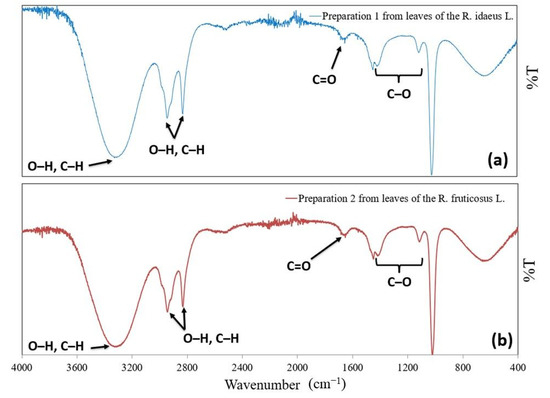 Analyses of preparations 1 and 2 from the leaves of R. idaeus L. and R. fruticosus L. was performed using total reflection-Fourier transform infrared spectroscopy (ATR-FTIR). An ATR unit obtained the spectra using a Thermo Scientific Nicolet 380 spectrometer (Thermo Fisher Scientific, Waltham, MA, USA). The recorded spectrum represented an average of 32 scans obtained with 4 cm−1. The spectra were collected in the wavenumber range of 4000–400 cm−1. The internal reflectance element (IRE) used in this study was an ATR diamond plate. The preparations were applied on the IRE.