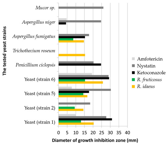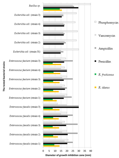 The plant preparation of R. idaeus leaves was active against seventeen microorganisms and R. fruticosus against sixteen tested strains of microorganisms. No activity was observed against Penicillium ciclopsis, Aspergillus niger, Mucor sp., or Escherichia coli, and in the case of blackberry preparation, additionally against Trichothecium roseum strain.