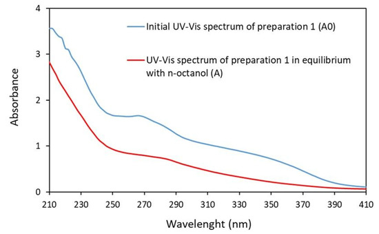 Our results show that the values of the partition coefficient determined by the shake-flask method for the preparations obtained from the Rubus idaeus L. (P1) and Rubus fruticosus L. leaves (P2) were −0.18 ± 0.001 and −0.19 ± 0.002, respectively; see Figure 5. Lipophilicity studies show that both preparations are highly hydrophilic.