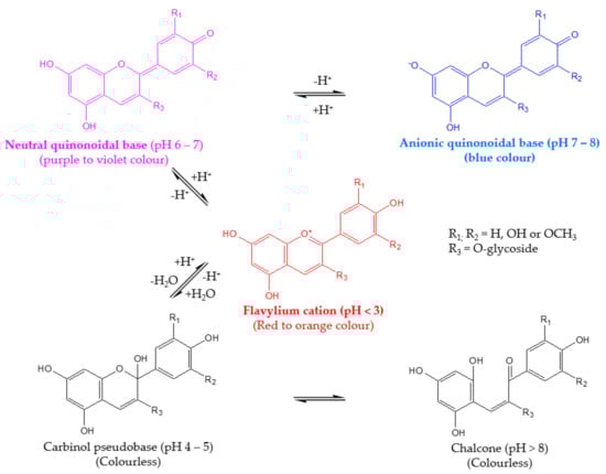 A particular issue with anthocyanins is their sensitivity to changes in pH since anthocyanins lose their color at pH values higher than 3.0; therefore, this limits their use as natural colorants to appear only in acidic food products [14]. As shown in Figure 1, at a pH below 3, anthocyanins exist mainly as the very stable red flavylium cation form. As the pH increases from 4 to 5, the colorless carbinol pseudobase is generated due to the rapid hydration of the flavylium cation. Deprotonation of the flavylium cation at pH 6–7 exhibits the formation of a neutral quinonoidal base (with a purple to violet color), which leads to the formation of an anionic quinonoidal base at pH 7–8 (blue color) [15,16,17,18,19].