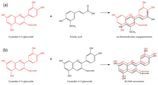 Examples of anthocyanin interaction. (a) Intermolecular copigmentation and (b) self-association. Adapted from Castañeda-Ovando et al. [24].