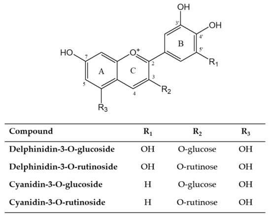 Annually, more than 300 tonnes of blackcurrant by-products are produced in the UK, containing high amounts of anthocyanins (14–18 mg/g) [29]. These by-products can be adopted relatively easily by the food industry and have been used as a natural food colorant for many years [7,30]. DBP constitutes four types of non-acylated anthocyanins, namely, delphinidin-3-O-rutinoside (D3R), cyanidin-3-O-rutinoside (C3R), delphinidin-3-O-glucoside (D3G) and cyanidin-3-O-glucoside (C3G) [29] (Figure 3). However, they are less stable than the acylated forms; thus, a reaction such as copigmentation must be carried out in order to increase their stability.