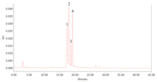 Typical HPLC chromatogram of DBP, showing the detected free anthocyanins at 520 nm. (1) Delphinidin-3-O-glucoside, (2) delphinidin-3-O-rutinoside, (3) cyanidin-3-O-glucoside, and (4) cyanidin-3-O-rutinoside.