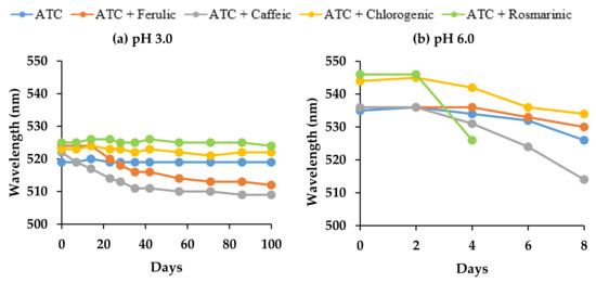 The copigmentation of anthocyanins with phenolic acids in buffer solutions increased the maximum absorption wavelength (bathochromic effect, ∆λmax) and absorbance (hyperchromic effect, ∆Amax), which, in turn, increased the color intensity of the anthocyanin solutions on the day of preparation (day 0), as shown in Table 1. At pH 3.0, rosmarinic acid had the highest percentage of hyperchromic effect (∆A = 20.2%) and bathochromic shift (∆λ = 6 nm), followed by ferulic acid (17.4%; ∆λ = 5 nm), chlorogenic acid (7.2%; ∆λ = 4 nm), and caffeic acid (7.7%; ∆λ = 3 nm), compared to the control (with no copigment) (Table 1a). When the copigment was another phenolic compound, the opposite charge of the compounds interacted to produce a charge-transfer complex formation or π–π interactions [43]. As the flavylium ion in the anthocyanin was positively charged, it became a suitable candidate for the formation of complexes via charge transfer with rich electron substrates [24], thus increasing the hyperchromic effect to the maximum absorbance [44].