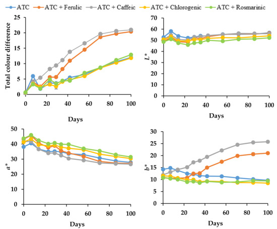 Effect of intermolecular copigmentation on total color difference, L*, a*, b*, chroma, and hue angle during storage at 20 °C in pH 6.0 buffer solutions. *Anthocyanins (ATC); L* (lightness); a* (redness/greenness); b* (yellowness/blueness).