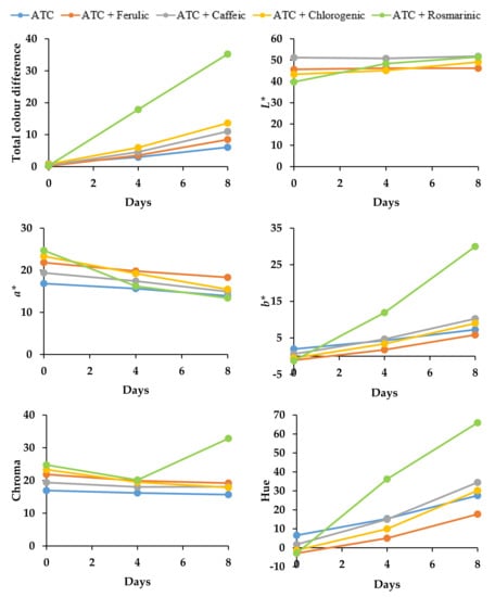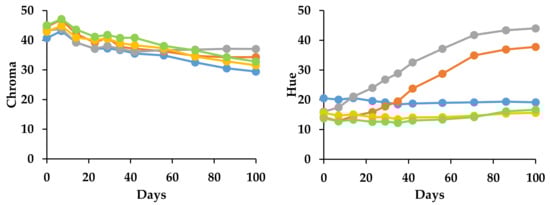 At pH 6.0, rosmarinic acid was found to greatly influence the color stability, whereas copigmented anthocyanins produced a yellowish/orange color relativity quickly during storage, starting from day 2, as shown in the rapid degradation of the bathochromic shift from 546 to 526 nm (Figure 5b). This is further supported by the significant correlation (p < 0.05) between the anthocyanins’ half-life and their color retention (R2 = 0.961, p < 0.05). A significant (p < 0.05) increase in b* and hue angle values (Figure 7) was also observed as a result of the yellow tonalities. Ferulic acid and control samples indicated higher color retention than other copigments; however, ferulic acid obviously had significantly higher (p < 0.05) chroma (color intensity) than the control sample.