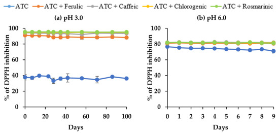 In the copigmentation reaction, the percentage of DPPH scavenging activities in all samples with copigments increased significantly ((p < 0.05); ~95.4% and ~82.3% at pH 3.0 and pH 6.0, respectively). These results are predictable since the added copigment itself is a phenolic acid with antioxidant activity. The significantly higher antioxidant capacity at pH 3.0 compared to pH 6.0 reflected the storage stability of anthocyanins in the copigment samples. Overall, scavenging activity with copigments was stable in all samples during storage at both levels of pH, even though the anthocyanins showed some degradation. This indicated that the degradation products of anthocyanins (phenolic acids and aldehyde) also contributed to the DPPH scavenging activity. Similar findings were reported by Seeram et al. [63] and Terefe et al. [64], where the anthocyanin degradation products (protocatechuic acid, phloroglucinaldehyde, and 4-hydroxybenzoic acid) after the heat treatment of tart cherries assisted in keeping the antioxidant capacity at similar levels. However, further studies are required to confirm any degradation of copigments during storage.