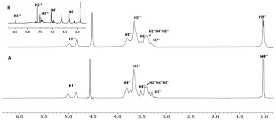The 1H NMR of (A) 2,6Me-β-CD (B) complex of QUE with 2,6Me-β-CD. The spectra were obtained at 25 °C in D2O.