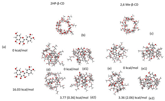 Calculated minimum energy structures: (a) QUE (above) and a local minimum of QUE (bottom), (b) 2HP-β-CD, (c) 2,6Μe-β-CD, (d) complex of QUE with 2HP-β-CD (d1) and complex of reversed QUE with 2HP-β-CD (d2) from two different points of view, and (e) complex of QUE with 2,6Μe-β-CD (e1) and complex of reversed QUE with 2,6Μe-β-CD (e2) from two different points of view. All calculations were performed in water solvent using B3LYP/6-31G(d,p). The energy differences between the conformations in complexes are shown for the B3LYP level of theory; energy differences calculated using PM6 are shown in parentheses.