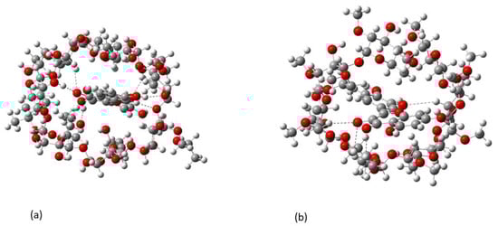 The lowest energy structure for QUE forms two intramolecular hydrogen bonds, O…HO. However, when QUE is encapsulated in both CD molecules, these two intramolecular bonds break, and new intermolecular hydrogen bonds are formed between the OH of QUE and O and HO atoms of the CD molecules. Thus, the encapsulated conformer of QUE has not adopted the lowest energy structure but one which is 16.0 kcal/mol higher in energy. This conformer does not have any intramolecular bonds and the catechol group is twisted by 37.5 degrees with respect to the pyran group due to H … H repulsion. The hydrogen bonds between QUE with 2HP-β-CD (a) and 2,6Μe-β-CD (b) are shown in Figure 7. Six hydrogen bonds are formed that range from 2 to 2.8 Å in the case of 2HP-β-CD and four hydrogen bonds are formed with 2,6Μe-β-CD within 2.8 Å. It is important to note that binging energies of H...O interactions longer than 2.8 Å are almost zero [51]. The complexation energies and the deformation energies of the involved CD and QUE molecules are shown in Table 8.