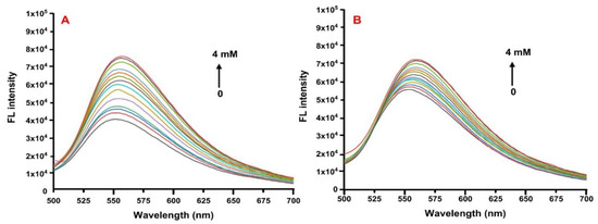 To determine the interaction between QUE and CDs, fluorescence spectroscopy was performed. The fluorescence intensity of a small ligand can be altered upon the encapsulation in the cavity of a supramolecule such as CD [55,56] The spectroscopic behavior of the ligand was explored by adding increasing concentrations of either 2HP-β-CD or 2,6Me-β-CD into a specific concentration of QUE. Upon the gradual addition of the 2HP-β-CD, the fluorescent intensity of the formed physical mixture was enhanced by 1.84-fold while a 1.32-fold enhancement was recorded in the case of 2,6Me-β-CD (Figure 9). This particular enhancement of the fluorescence signal is usually observed, once a small molecule interacts with CD due to the changes occurring in the microenvironment of the small molecule upon encapsulation [57]. The binding constants of the complexes were derived from the Benesi−Hildebrand equation: