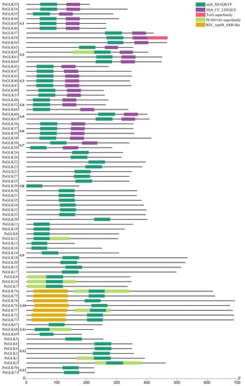 Division of 78 PeGLK genes into 13 groups (G1–G13) based on predicted domain structures. Domains are represented by different colored boxes.