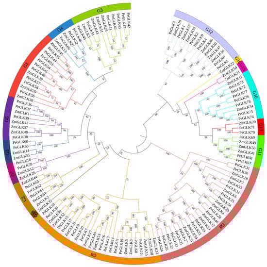 From a phylogenetic tree formulated on the aligning of 137 sequences of GLK proteins from moso bamboo (78) and maize (59), the phylogenetic relationships of GLK proteins among different species were derived. The characteristics of ZmGLK genes from maize are listed in detail in Table S1. In this phylogenetic tree, GLK family members were classified into 16 groups based on evolutionary relationships and motif analysis, and poplar GLK family members were allocated into 13 groups (G1–G13, but not G14–G16). The numbers of PeGLKs in different groups were uneven: groups 1 to 13 contained 9, 4, 7, 5, 3, 4, 2, 15, 14, 7, 3, 6, and 2 genes, respectively (Figure 2).