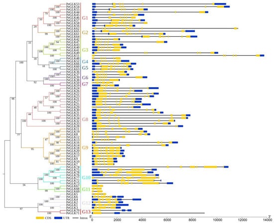 Phylogenetic relationship and gene structures of PeGLKs. Left: Neighbor-joining (NJ) phylogenetic tree was constructed by MEGA 7.0 according to PeGLK protein sequences. Proteins in tree were divided into 13 distinct subfamilies, which are distinguished by different colors. Right: Exon/intron structures of PeGLK genes were generated by online GSDS. Yellow rectangles, gray lines, and blue rectangles represent exons, introns, and untranslated regions (UTRs), respectively. The numbers at nodes indicate the bootstrap values per 1000 replicates determined by the neighbor-joining method.