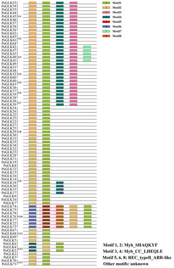 Schematic representation of eight conserved motifs (1–8) in PeGLKs, ordered based on online MEME analysis. Lengths of motifs are displayed proportionally.