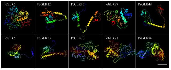 The structure and homology modeling of PeGLK proteins were determined by Phyre2, and alignment of the protein sequences with HMM-HMM search was conducted in intensive mode [41]. As a result, all 78 PeGLK proteins could be modeled with certainty. As shown in Figure 5, 10 PeGLKs (PeGLK5, PeGLK12, PeGLK13, PeGLK29, PeGLK49, PeGLK51, PeGLK53, PeGLK70, PeGLK71, and PeGLK74) had 100% of their predicted length modeled with >98% confidence.
