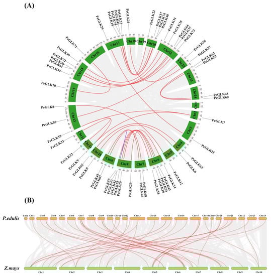 Duplication events of GLK proteins. (A) Synteny of moso bamboo PeGLK genes. (B) Synteny of moso bamboo and maize GLK genes. All syntenic genes were located on a map; segmentally duplicated GLK gene pairs are linked by red lines and tandemly duplicated genes by purple lines.