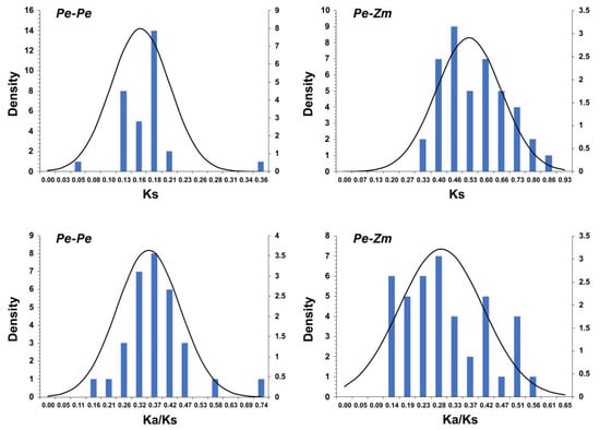 Ks and Ka/Ks value distribution of PeGLK genes in paralogous gene pairs (Pe-Pe) of moso bamboo genome and orthologous gene pairs between moso bamboo and maize, viewed through frequency distribution of relative Ks and Ka/Ks modes.