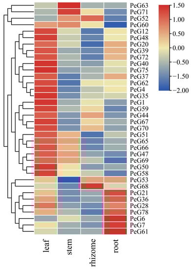 Tissue-specific gene expression profiles provide critical clues for exploring gene function. In order to characterize the expression levels of PeGLKs, we analyzed the transcription levels of 36 PeGLK genes selected as representatives of each subfamily in four different tissues (leaf, stem, rhizome, and root) of moso bamboo (Table S3). As shown in Figure 9, the vast majority of PeGLK genes (except for PeGLK6, PeGLK7, PeGLK52, PeGLK61, PeGLK63, PeGLK68, PeGLK71) in the leaf, nine genes (PeGLK47, PeGLK51, PeGLK52, PeGLK60, PeGLK63, PeGLK65, PeGLK66, PeGLK69, PeGLK71) in stem, four genes (PeGLK44, PeGLK52, PeGLK53, PeGLK68) in rhizome, and 12 genes (PeGLK6, PeGLK7, PeGLK20, PeGLK21, PeGLK28, PeGLK36, PeGLK37, PeGLK39, PeGLK53, PeGLK61, PeGLK72, PeGLK78) in root presented high expression levels. Interestingly, the expression level of most PeGLKs was significantly higher in leaf than in the other tissues. We also defined that some genes showed a tissue-specific expression pattern. For example, PeGLK20, PeGLK21, PeGLK28, PeGLK36, PeGLK37, PeGLK39, PeGLK72, and PeGLK78 displayed high expression levels in leaves and roots, but low levels in stems and rhizomes. PeGLK52 exhibited high expression levels in stems and rhizomes, but low levels in leaves and roots. PeGLK47, PeGLK51, PeGLK60, PeGLK65, PeGLK66, and PeGLK67 presented high expression levels in leaves and stems, but low levels in rhizomes and roots. PeGLK44 and PeGLK70 displayed high expression levels in leaves and rhizomes, but low levels in stems and roots. In addition, only PeGLK63 and PeGLK67 were prominently expressed in stems, and only PeGLK68 was prominently expressed in rhizomes, whereas PeGLK6, PeGLK7, PeGLK21, PeGLK36, PeGLK61, and PeGLK78 were relatively higher in roots, PeGLK63 and PeGLK71 in stems, and PeGLK52 and PeGLK68 in rhizomes than in the other tissues. Among our previously identified paralogous genes, five pairs (PeGLK60 and PeGLK63, PeGLK62 and PeGLK65, PeGLK67 and PeGLK68, PeGLK70 and PeGLK72) shared the same or similar expression patterns in the four tissues, revealing the same evolutionary fate of duplicated genes. Above all, PeGLKs displayed diverse expression profiles in different tissues, which provides insight into the role of PeGLKs in multiple growth and development of Phyllostachys edulis.