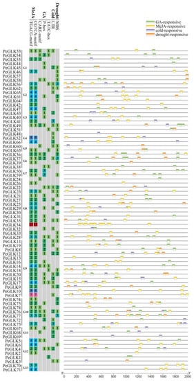 To determine the cis-regulatory elements in the putative promoter regions, we used PlantCARE to detect the 2000 bp upstream sequences of PeGLK genes [44]. Results portray that many cis-regulatory elements corresponding to LTRE (cold-responsive element), DRE (drought-responsive element), MeJA, and GA were detected, indicating that PeGLKs participate in plant development and stress responses (Figure 10).