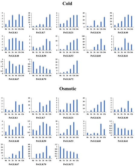 Expression patterns of 13 representative PeGLK genes in response to abiotic stress treatments. X-axis and Y-axis indicate time points after cold and osmotic treatments, and relative expression levels are standardized to reference gene TIP41.