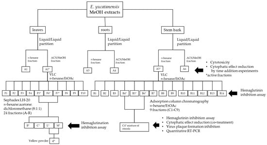 The leaf (38.10 g), root (0.24 g) and stem bark (1.04 g) MeOH extract were processed with a liquid–liquid partition using MeOH/ACN/n-hexane, following the method described by Borges-Argáez et al. []. Briefly, each extract was dissolved in MeOH and ACN (acetonitrile), placed in a separation funnel and extracted with n-hexane at a 1:1:3 ratio (v/v/v); this was repeated three times. Both the n-hexane fraction and the ACN/MeOH fraction were obtained after drying under reduced pressure. Fractions A1 (n-hexanic extract), A2 (ACN/MeOH extracts) from the leaves, A3 (n-hexanic extract), A4 (ACN/MeOH extracts) from the roots, A5 (n-hexanic extract), and A6 (ACN/MeOH extracts) from the stem bark were selected for cytotoxic and antiviral evaluation (i.e., pre-treatment, co-treatment and post-treatment) (Figure 1).