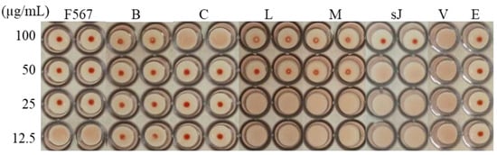 Hemagglutination inhibition activity of fractions F567, B, C, L and M and flavone sJ from the leaves of E. yucatanensis. Results: full inhibition (red button) or no inhibition (no red button). Controls: virus + erythrocytes (V) and erythrocytes (E).