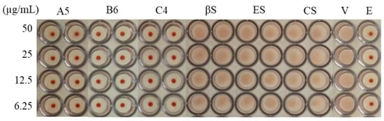 Hemagglutination inhibition assay of some stem bark fractions from E. yucatanensis. Results: full inhibition (red button) or no inhibition (no red button). HI assay of stem bark fractions (A5, B6 and C4) and analytical standards of β-sitosterol (βS), stigmasterol (ES) and campesterol (CS). Controls: virus + erythrocytes (V) and erythrocytes (E).