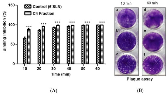 The inhibition of viral HA binding and MDCK cell infection was assessed using a plaque assay. In the presence of 6′SLN, plaque formation was inhibited at 60% after only a 10 min incubation (virus + 6′SLN) and reached 100% inhibition after 30 min. Interestingly, in the presence of 3.125 μg/mL of C4, this fraction’s inhibitory activity reached 90% at only 10 min of incubation and further increased to 100% after 30 min (Figure 5). The inhibitory effect of 6′SLN and the C4 fraction remained constant throughout the entire hour of incubation. Since plaque assays are used to quantify influenza virus replication rates, these results suggest that the components in the C4 fraction inhibited viral hemagglutinin binding to host cell sialic acid, thus preventing entry into the cell.
