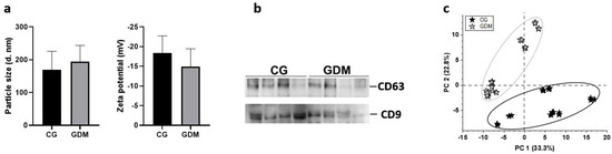 Dynamic light scattering assays were performed for characterization of size and stability of concentrated exosome vesicles. In line with previous reports [17], we obtained <200 nm vesicles, with non-significant differences between CG and GDM samples, as observed in Figure 1a. Additionally, a good stability of the nanovesicles was obtained (average Zeta potential of −18.4 for CG samples and −14.9 mV for GDM exosomes), as measured by the Zetasyzer system, after the applied concentration methodology. Representative dynamic light scattering images are provided in the Supplementary Material.