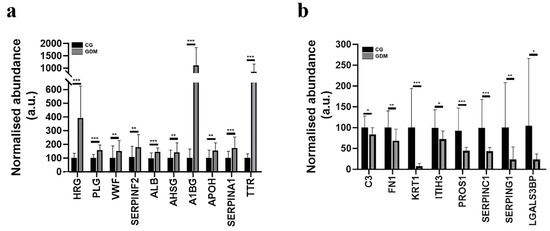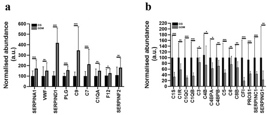 Histograms showing the normalized abundance alterations induced by gestational diabetes for exosomal proteins associated with the complement and coagulation cascade KEGG pathway (HSA04610). (a) Up-regulated proteins and (b) down-regulated proteins after comparing the spectral abundance of GDM (diabetic gestational group) to CG (control group). Data represent the mean ± SD; * p ˂ 0.05; ** p < 0.01; *** p < 0.001.