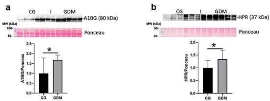 Validation by Western blotting of some protein markers identified by mass spectrometry: (a). Alpha-1-B Glycoprotein (A1BG) and (b). Haptoglobin-related protein (HPR). Representative immunoblots and densitometric analysis for each protein are shown. Ponceau S staining was used for normalization of the proteins’ levels. Western blot analysis of serum exosome lysates demonstrated protein level alterations in A1BG and HPR in the GDM vs. CG comparison. Statistical analysis was performed using unpaired Student’s t test, and the results were expressed as means ± standard deviation (SD); * p ˂ 0.05. CG: control group (n = 6) and GDM: gestational diabetes group (n = 6).