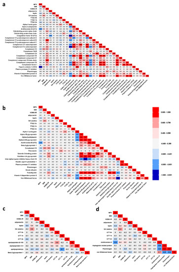 Illustrations showing the associations after applying the statistical Pearson correlation test; (a) correlations between parameters and protein molecules belonging to the complement and coagulation cascade signaling pathway; (b) correlations between the clinical parameters and proteins involved in platelet degranulation pathway; (c) correlations between serum parameters and proteins involved in cholesterol metabolism signaling pathway and (d) correlations for prothrombotic factor proteins and clinical parameters. Pearson correlation coefficient is presented from 1 (most significant positive correlation) to −1 (most significant negative correlation).