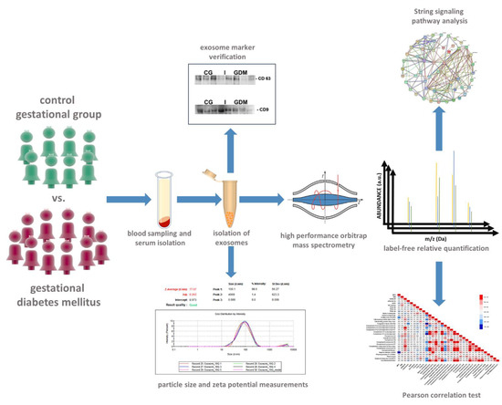 Experimental workflow and methodological approaches. The patients were divided into two groups based on oral glucose tolerance test (GTT) at 0 h, 1 h and 2 h during the third trimester of pregnancy: 8 were considered the control gestational group (CG), while 10 patients formed the gestational diabetes mellitus group (GDM). Blood was drawn from each patient and control subject for serum isolation, exosome enrichment and subsequent proteomic analyses. Label-free relative quantification was followed by bioinformatic pathway analysis. Pearson correlation was pursued to associate the regulation trend of the differentially abundant molecules with clinical and paraclinical variables.