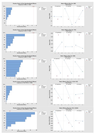 Figure 1 shows the pareto and main effects charts obtained with the DOE analysis for each target analyte. All analytes have different pareto charts, but none of the evaluated parameters (factors with influence on analyte recovery) had a significant influence on the response, except for THC-COOH, for which all factors showed a significant influence. In the main effects plots, we observe the individual effect of each factor under study. A lower number of sample draw–eject cycles (4 × 150 µL) results in greater recoveries for most of the target analytes except THC. Regarding the number of sorbent washes, a single wash (1 × 50 µL) also gave a better response for all analytes except CBN. Finally, the number of elutions varied for each analyte. While better recoveries were obtained with a lower number of elutions (1 × 100 µL) for THC, CBN and THC-COOH, a greater number of elutions (5 × 100 µL) appeared as the most suitable for CBD and 11-OH-THC. Overall, one should consider that all these factors had no significant influence on the response for most cannabinoids, and only THC-COOH was markedly influenced. In addition, THC-COOH is the main metabolite in urine samples and the most important for cannabis consumption confirmation. Since all factors revealed a significant influence on THC-COOH and interactions between factors also appear to play a significant role on its recovery, it was important to optimize the method further.