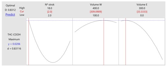 Further optimization was applied using response surface methodology (RSM), since the above experimental design did not allow for drawing a proper conclusion due to interactions between components, namely for THC-COOH, for which interactions had a significant influence. A new matrix containing the same variables (number of strokes, amount of washing, and number of elutions) was constructed. The number of strokes ranged from 1 to 15, the volume of washing solvent ranged from 150 µL to 450 µL, and the volume of elution solvent ranged from 50 µL to 250 µL.