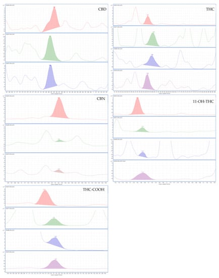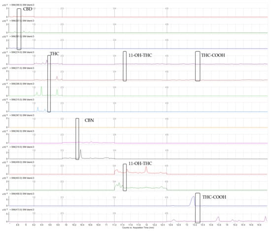 The selectivity of the method demonstrates its capacity to detect the compounds under study in the presence of additional interference from the biological samples analyzed [,]. Drugs and endogenous components that produce similar high molecular weight ions may potentially interfere if their retention times are similar and unsuitable ions are chosen for monitoring. For this reason, the selectivity of the method was assessed by analyzing ten distinct blank urine samples collected from laboratory staff members who did not consume cannabis. Additionally, three typical molecular weight ions for each analyte were chosen carefully, where no matrix or endogenous interferences were observed, as can be observed in a blank sample (Figure 3).