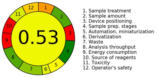 This method was classified according to the according to the AGREE-Analytical GREEnness Metric Approach, in which all its steps are individually evaluated concerning their greenness [,]. Considering this classification, the main limitations of this method are the need for sample pretreatment and the fact that it involves manual operation (Figure 5).
