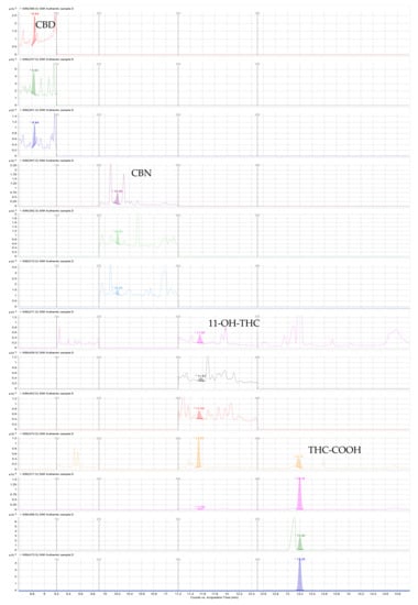 The most analyzed cannabinoids in clinical toxicology are Δ9-tetrahydrocannabinol (THC), which is the most psychoactive of the cannabinoids listed; 11-hydroxy-Δ9-tetrahydrocannabinol (11-OH-THC), a hallucinogenic metabolite obtained by microsomal hydroxylation of THC; the inactive substance 11-nor-9-carboxy-Δ9-tetrahydrocannabinol (THC-COOH), a product of the oxidation of 11-OH-THC with great interest for diagnostic purposes; cannabidiol (CBD), also a prevalent cannabinoid in marijuana plants; and cannabinol (CBN). These last two cannabinoids have no known psychoactive properties [,,,].