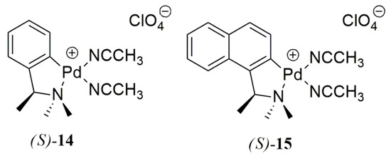 Other than the cases described in Achiwa’s work [55,56], our attempts to separate BIMOPO (9c) enantiomers by fractional crystallization with addition of DBTA did not lead to satisfactory results. This was the case with further efforts to use chiral acids such as 2,3-di(phenylaminocarbonyl) tartaric acid [57], monodimethylamide DBTA, naproxen, mandelic acid or similar tested in a wide range of organic solvents. Surprisingly, resolution of racemic BIMAPO (11b), which contains amino groups at 5,5′-positions, also failed. Our further attempts focused on the application of chiral C,N-palladacycle complex which binds the bisphophine ligands. For this purpose, the palladium complexes 14 and 15 were used, which have been synthesized according to the literature data [58] (Figure 5).
