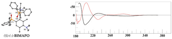 An alternative route to enantiomerically pure ligands include the application of (semi)preparative chiral column chromatography. The racemic bisphosphine oxide BIMAPO (11b), was separated using Daicel Chiralpak AD column (250 × 10 × 10 um), which was eluted with hexane 88%, Et2NH (10–-3% in hexane) 10%, i-Pr 2% with a rate of 4 mL/min. Obtained enantiomers were then reduced with phenylsilane to the desired bisphosphine without any racemization in 87% yield. The enatiomers of TetraPHEMPO (11d), and BIClPO (11c) were separated similarly. The enantiomeric composition of all bisphosphine dioxides could be determined by means of chiral HPLC analysis or NMR spectroscopy [52,54]. The Figure 6 presents X-ray structure of enantiomerically pure (S)-(-)-BIMAPO which crystallizes as a solvate with benzene molecules, and the CD spectra of (S)-(-)-BIMAPO and (R)-MeO-BIPhEPO used as a reference compound with known opposite to BIMAPO absolute configuration of biaryl core.