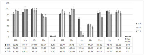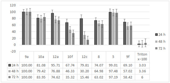 In the second set of poorly soluble compounds, tested at a concentration of 50 µM (see Figure 8), one compound (12b) showed a slight cytotoxic effect on human cells (5% decrease in cell viability), some, despite initially demonstrated effectiveness, weakened with increasing exposure time (11b, 10b, 11f, 10c), and some compounds’ activity increased in a time dependent manner (11a, 13c, 11c, 11e, 9a, 9). Compound 11d exhibited the highest toxicity, which after 24 h of incubation led to a decrease in cell viability by about 95%, and such effect remained constant up to 72 h of exposure, therefore it was found to be the most cytotoxic among all of the tested agents.