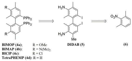 Herein, we describe an efficient strategy allowing access to axially chiral biaryls bearing phosphorus functionalities and diversified substituents at 5,5′-positions. Such phosphines are known to be potent bidentate ligands for transition metals to be used in different types of catalytic asymmetric transformations. The particular design of the ligands implies that the complexes derived from them will adopt the same stereometry, but the electronic properties of the transition metal will depend on the substituent introduced in ligand core [28]. The ligands were obtained in a short sequence of good-yielding transformations, which started from commercial 1,3-dimethyl-2-nitrobenzene and leading through the formation of a single universal 5,5′-diamine precursor DIDAB (6,6′-diiodo-2,2′,4,4′-tetramethylbiphenyl-3,3′-diamine, 5). We also report the preparation of a new C2-symmetrical BIMOP (4a) related ligand [26] with dimethylamine group at 5,5′-positions, hereafter named BIMAP (4b), and its successful optical resolution carried out with the use of the chiral cyclopalladated derivative and/or by the resolution of the isomers using HPLC with a chiral stationary phase column. The classical approach to the new chiral non-racemic electron-deficient ligand BIClP (4c) with chlorine atoms at 5,5′-positions is reported as well. Our approach was also optimised to obtain the highly known and efficient ligands TetraPHEMP (4d) [18] and BIMOP [26].