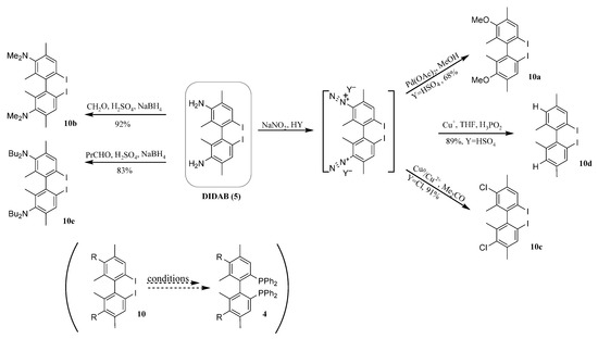 DIDAB, as the designed universal precursor of all planned chiral bisphosphines, was subsequently transformed by classical transformation of amino groups as presented on Scheme 3, into a series of diiodobiphenyl derivatives with different substituents at 5,5′-positions to be used in further phosphorylation reaction steps.