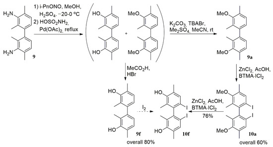 Alternatively, racemic compounds 10a could be obtained from the early precursor, diamine 9, in the sequence of high-yielding reactions as presented on Scheme 4 in good 60% overall yield. The iodination reactions of other 3,3′-diamino and 3,3′-dimethoxy substituted 2,2′,4,4′-tetramethylbiphenyls were not as efficient or selective.
